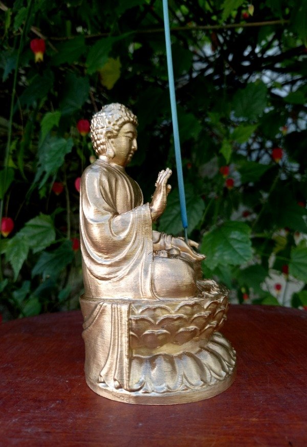 Buda porta sahumerio impreso en 3d de alta calidad y pintado artesanalmente con esmalte oro.